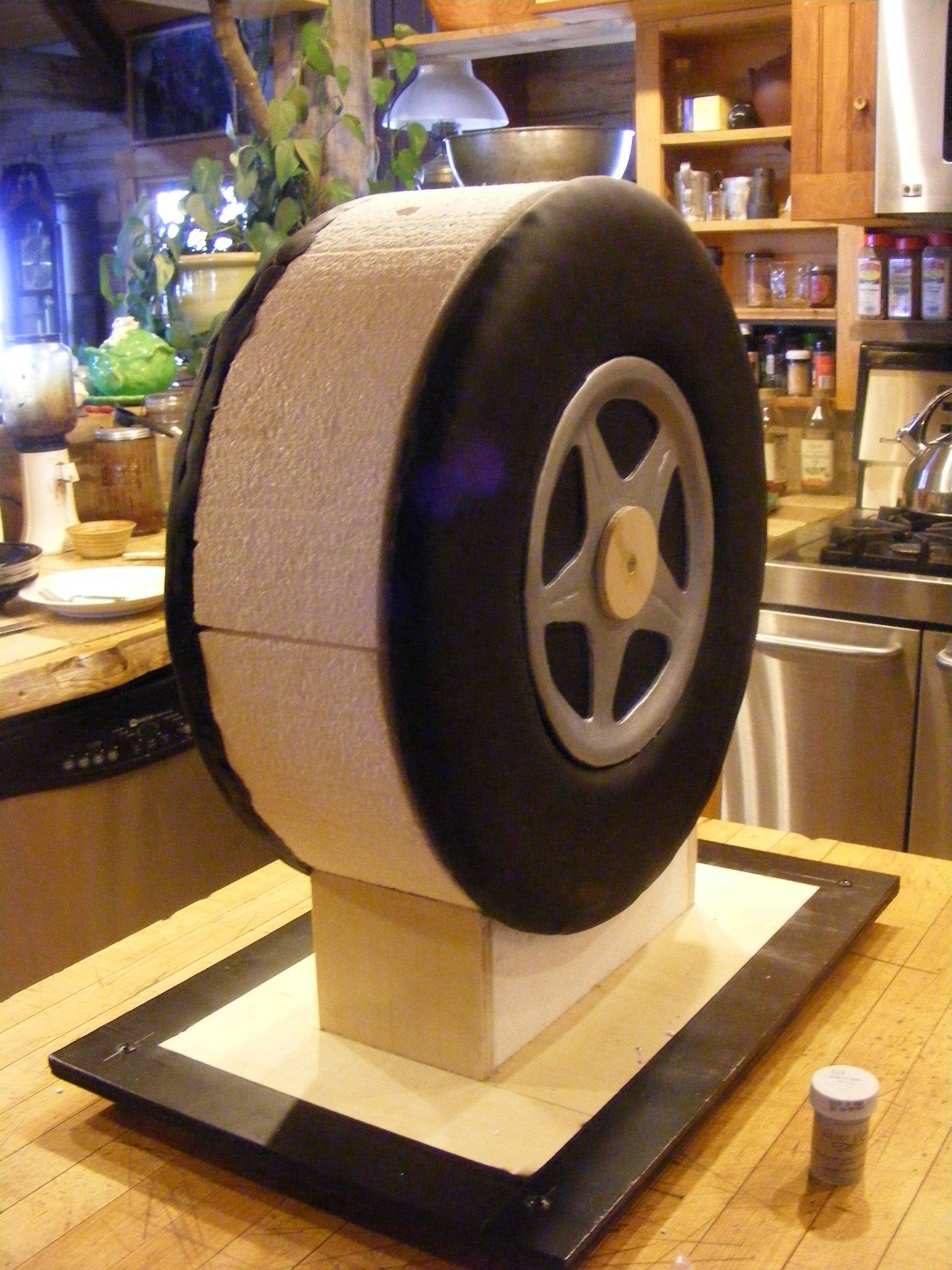 I was asked to make a truck tire stuck in the mud spraying a tiered wedding cake with mud. There are cakes on the internet doing this and the bride gave me a picture of one that she liked. The wedding was about an hour away on roads that I knew would not be kind to a cake that was top heavy. The ideas that I got from my laptop were helpful but I was not not completely sold that anything I saw would guarantee a safe trip. My husband is a woodworker and a willing participant in creating cake structures for me.
